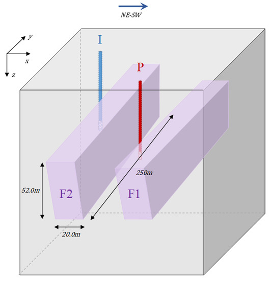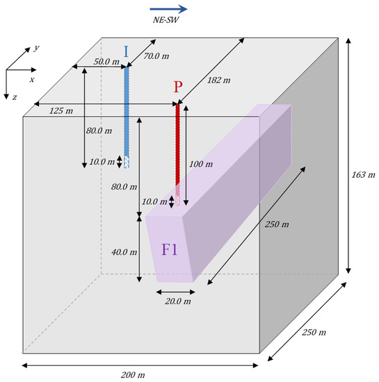 The experimental campaign revealed a sub-vertical fault zone, NW–SE oriented. The injection well is located at 135 m (Figure 2) from the production well, in the rearward direction. From the stratigraphical data of the exploration well, two different faults were found between 100–120 and 180–240 m b.g.l., according also to the results of the detailed geophysical survey. The deepest fault if projected towards the injection well may or may not meet this well at about 80 m depth. For this reason, two case studies were analyzed, one with the fault crossing the injection well and the other without. The fault zone presents the same characteristics of the layer identified by the number 10 in Table 2.