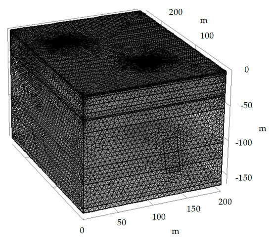 A 3D unstructured mesh, refined near all the boundaries to capture the larger gradients of both flow velocity and temperature, was used. Indeed, the grid needs to be finer in the region of greatest change in the skin zone close to the well and can be coarser further out in the reservoir [67]. For the sake of clarity, the mesh used for the case of a single fault is reported in Figure 6.