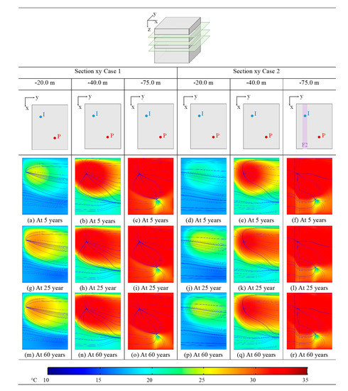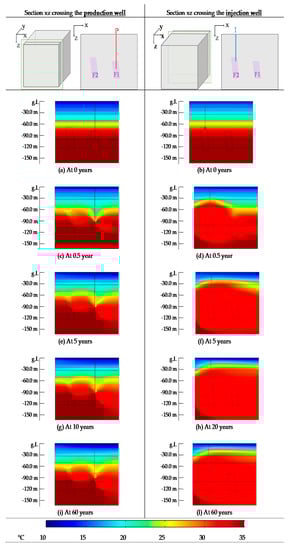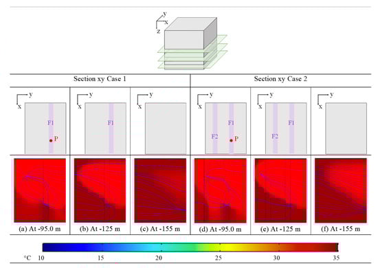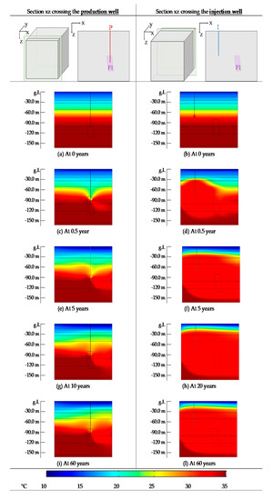 The temperature fields at different times in the xz plan cutting the domain in correspondence of the two wells’ axes are reported in Figure 7 for the case of the single fault (Case 1) and in Figure 8 for the case of double (Case 2) fault zones. For the sake of clarity, the section cuts are also reported.