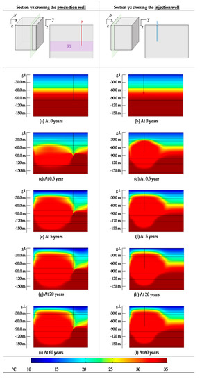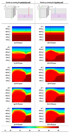 The temperature field, at different times, in the yz plan cutting the domain in correspondence of the axis of two wells is shown in Figure 9 and Figure 10 for Cases 1 and 2, respectively. For the sake of clarity, the section cuts are also reported. In these plots, it can be noticed that the temperature decrease caused by the injection well is localized in the region of the domain behind the production well and it is less pronounced in Case 1. In Case 1 the temperature propagation is more pronounced towards the upper layers, whereas in Case 2 it is larger in the bottom of the domain.