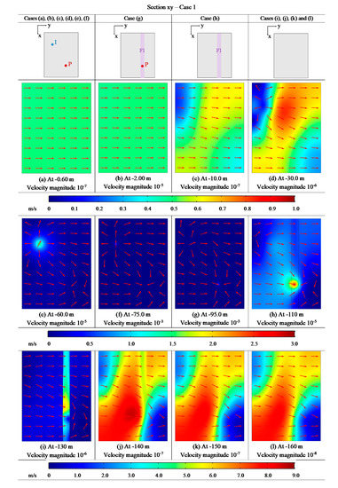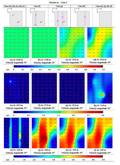 In the sections that cut the wells (refer to Figure 13f,g and Figure 14f,g), the Darcy velocity field and magnitude are similar in Case 1 and Case 2. Obviously, the magnitude is significantly higher than at other depths due to the flow extraction and injection. A different trend can be observed in sections 10.0 m distant from the bottom of the wells in the vertical direction (refer to Figure 13e,h and Figure 14e,h), mainly in the areas surrounding the injection well. The fault affects the groundwater flow, whose magnitude increases in the area surrounding the injection well and decreases upstream of the production well. However, a vertical distance of 10.0 m is sufficient to observe a significant decrease in the Darcy velocity, which tends to the undisturbed value as the horizontal distance from the wells increases. At higher depths, the velocity magnitude continues to decrease (refer to Figure 13i,l and Figure 14i,l). The velocity magnitude is higher in the central region of the considered section, where the groundwater has the same direction of the undisturbed fluid flow in both cases, injection and extraction.