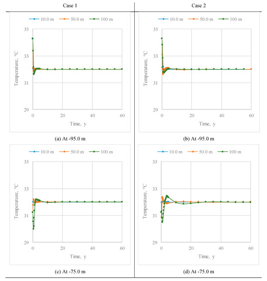 Finally, in Figure 15, the temperature over time is plotted at three different distances from the wells (10, 50, and 100 m) at a depth equal to half of the filtering sections of the wells, for the two cases analyzed.