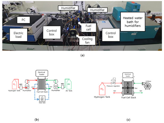 Figure 1a shows the operating system for the fuel cell’s performance test. The system comprised fuel supply, electrical and temperature control, and data acquisition and control parts. In the fuel supply part, hydrogen of 99.9% purity was supplied from the gas cylinder and air was supplied from the air compressor. For flow-through operation, a mass flow controller was installed to adjust the flow rate and, thereby, ensure that enough fuel was supplied to the load. An analog pressure regulator was installed at the front of the anode to maintain the fuel supply pressure at 0.5 bar for the dead-ended operation. A gas-to-liquid-type membrane humidifier was used, as necessary, as an external humidifier for gas humidification.