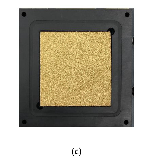 Two types of channels and metal foams were applied as flow fields. The general channel-type flow field took the form of a 4-channel serpentine in the widely used graphite separator. Metal foams were selected through a metal foam optimization study, as described in our previous work [47]. This involved a gold-coated nickel foam compressed to 0.5 mm (compression ratio of 25%) and inserted into a graphite separator as a chamber. Figure 2b,c show the serpentine channel and metal foam flow fields, respectively.