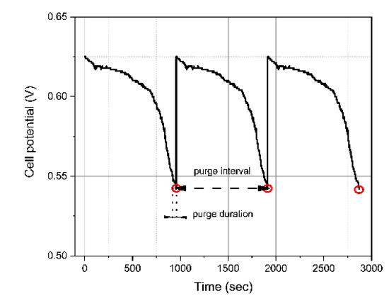Figure 5 shows a plot of the typical voltage with time for dead-ended operation. As shown in this figure, the purge interval is defined as the duration between consecutive purge valve openings, and the purge duration is the duration for which the purge valve is open during each purge. Further, the limit voltage is defined as the voltage at which the purge valve is opened.