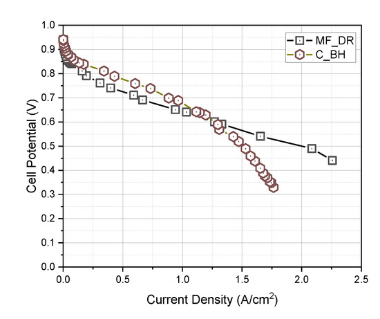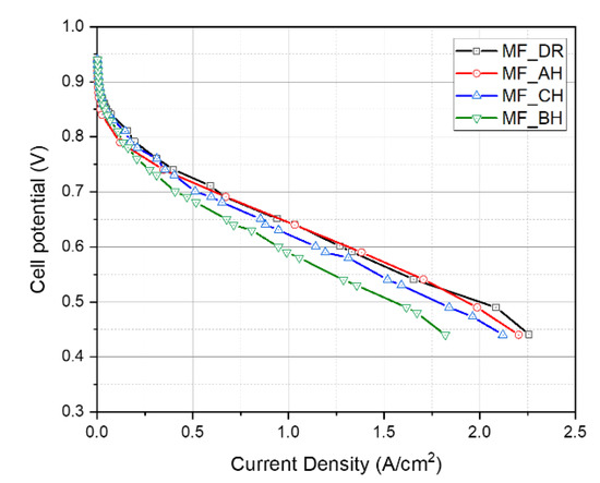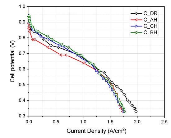 In Figure 6, at low current densities, a PEFC with a serpentine channel under the BH condition (C-BH) exhibited the best performance, whereas one under the DR condition (C-DR) showed the worst performance. This is because humidification increases the membrane hydration, thus helping to improve the ionic conductivity of the membrane. However, at higher current densities, the performance became similar and decreased rapidly. This was likely due to flooding or fuel starvation within the cell. However, because enough fuel was supplied, the performance decrease is attributed to flooding alone.