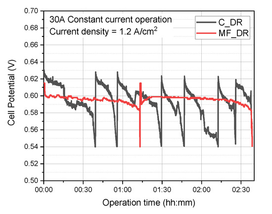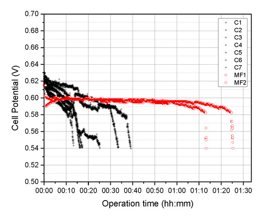 As shown in Figure 9, the PEFC with a channel-type flow field (black line, C1–C7) showed a very high voltage fluctuation, and the purge interval was unstable. However, the PEFC with a metal-foam-type flow field (red line, MF1 and MF2) showed a sudden voltage drop immediately after purging and performed stably with a constant voltage compared to the channel-type PEFC. Figure 10 shows the voltage variations during operation for more than 2 h.