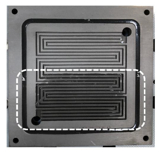 In addition, Figure 11 shows the channel-type flow field after dead-ended operation; the cell was dismantled to check the flow field. Consequently, water aggregation at the end of the outlet side was confirmed. This highlights that the expected gradual accumulation at the end of the channel was the cause of flooding.