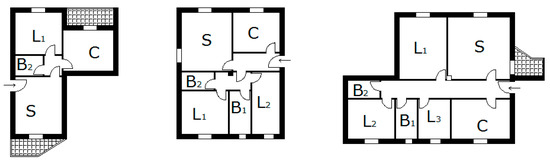 Typologies of apartments in the analyzed building (S: living room, B: bathroom, L: bedroom; C: kitchen).