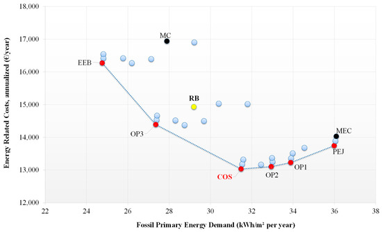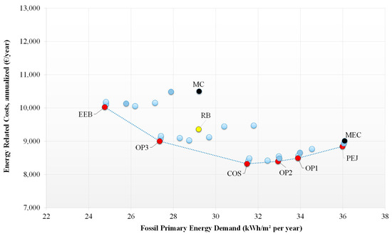 Every package of measures was characterized by a precise value of the annual primary fossil energy demand and the corresponding energy-related annualized costs, opportunely plotted. Thus, the set of the packages considered determined a graph where the frontier points in the lowest part denote the Pareto front, representing the geometrical place that joins the optimal outcomes with a broken line. No points can be detected beyond the Pareto front, with the EEMs close to the y-axis that indicate interventions characterized by lower primary energy demands but higher costs, whereas the points close to the x-axis represents interventions that lead to lower costs but higher primary energy requirements and CO2 emissions. Usually, the solution with the lowest annualized energy-related cost identifies the cost-optimal solution. In the graphs, only some representative points with remarkable results were highlighted. In particular, in every graph the points listed in Table 9 were emphasized.