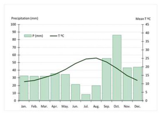 A green roof was installed ona building located on Benaguasil, a small town in the Mediterranean coast of Spain. As a reference, aclimograph of Valencia was included, which is the nearest city (at a distance of about 18 km and with similar altitude) with available weather data (Valencia weather station of Viveros). In Valencia, the average annual temperature is 23.0 °C during the day and 13.8 °C at night. In January (the coldest month), the temperature typically ranges from 14 °C to 20 °C during the day and 4 °C to 12 °C at night. In August (the warmest month), the average temperature registered over the last 80 years in Valencia was around 25 °C (Figure 1). Furthermore, specific temperature data of the Benaguasil area ranged from 28 °C to 34 °C during the day and about 22 °C at night.