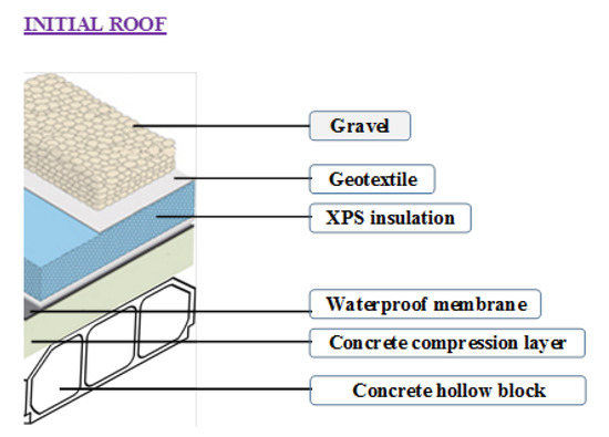 In our case, the detailed structure (Figure 3) incorporates the following elements: gravel layer (gravel diameter in the range of 20 to 50 mm and 1700 kg/m3 bulk density, 50 mm of layer thickness), geotextile filter layer (2 mm), extruded polystyrene (XPS) insulation (40 mm), waterproofing membrane (5 mm) and concrete hollow block (300 mm).