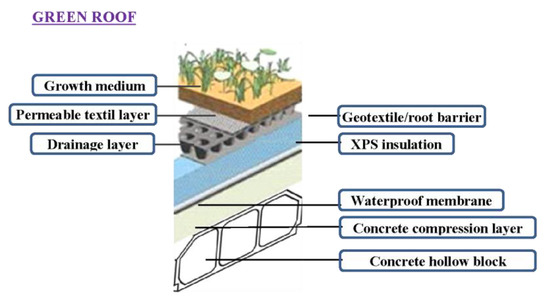 The green roof was built over the present “inverted roof”. It was decided to remove the layer of gravel and a water retention layer was added below the growing medium (separated with a filter fabric layer). This storage layer increases the capacity of the roof for retaining water after a rain episode and significantly reduces the amount of runoff generated. Figure 4 displays the green roof structure, which includes the following layers: growth medium (80 mm thickness), permeable textile layer (2 mm), drainage layer (water storage layer, 30 mm), geotextile layer/root barrier layer (3 mm), XPS insulation (40 mm), waterproofing membrane (5 mm) and a concrete hollow block (300 mm).