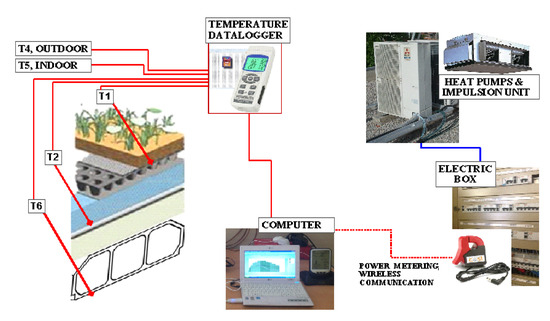 All these thermocouple signals were stored every minute in a data logger, together with the electricity consumption of the two heat pumps and the impulsion unit of the air conditioning system of the area covered by the green roof. In addition, wind velocities and solar radiation were provided by a nearby meteorological station.