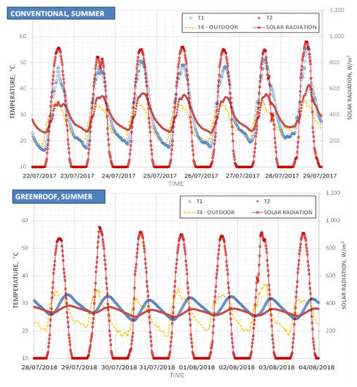 The experimental campaigns check the green roof effects on the building energy efficiency during 20 months (July 2017 to March 2019). During the first period, from July 2017 to February 2018, measurements correspond to the “conventional” roof. In February 2018, the external gravel layer of the conventional roof was replaced by the green roof. Thus, from March 2018 to March 2019, registered data corresponded to the green roof effects. Figure 8 displays typical traces for the temperatures and solar radiation obtained for the conventional and green roof campaigns, respectively, along an entire week during the summer period.