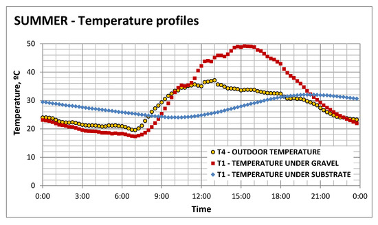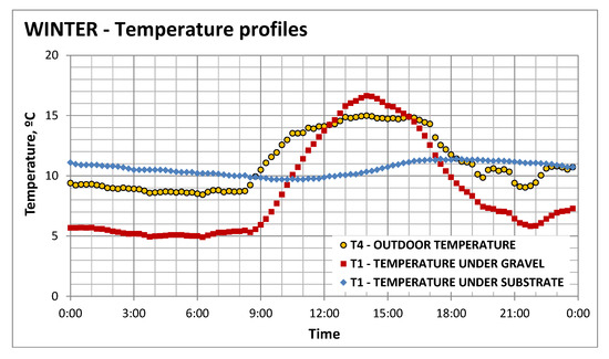 Once the green roof is installed, the differences in energy consumption between the summer and winter periods reduced significantly to less than 15%, higher for the winter period in this case, whichcould be explained by the absence of the gravel layer as aheat source. This interpretation is supported by the data presented in Figure 9 and Figure 10, where the evolution of the temperature along a similar day during the summer and winter periods, respectively, is presented for the conventional and green roof situations. Similar days were selected in terms of similar ambient outdoor temperature, humidity and solar radiation. During the summer, ambient outdoor temperature was 35 °C and the gravel reaches 50 °C, while with the presence of the green roof, this effect is smoothed and the temperature in the roof does not exceed the ambient outdoor temperature; in fact, it is below that value, namely, 32 °C.