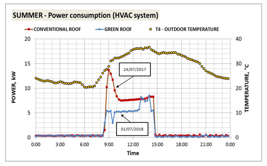 Data comparingtwo similar days during summer time with both types of roofs areshown in Figure 11. An initial peak power was observed to start building conditioning, as is the case for the conventional roof; once a stable situation is reached, however, the power demand with the green roof is 20% less than with the conventional one.