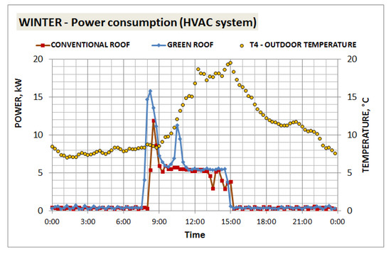 A similar comparison is presented in Figure 12 for two similar days in the winter period. Power demand is very similar for both types of roof, but slightly lower in the case of the conventional one.