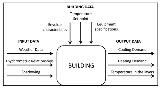 Figure 13 shows the input data for the simulation, external conditions, building characteristics and temperature set points, and the deduced outputs, temperatures in the different layers of the roof and cooling and heating demand along the year.