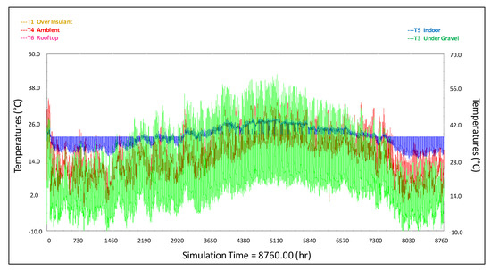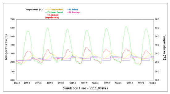 In the case of the week validation, temperatures of the different layers of the roof were determined with the model and results (Figure 14) were compared with the corresponding experimental data. Maximum simulated temperatures of 59 °C were obtained during summertime in the gravel, while registered data during the same time period revealed a temperature range of 45 °C to 55 °C.