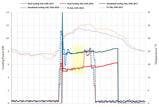 One-day validation was performed using as a reference two similar days in terms of environmental parameters (temperature, humidity etc.) and use-of-space (workday) during the experimental campaign, one for each of the two different types of roof considered, on 24th July 2017 (conventional roof) and 31st July 2018 (green roof), in order to deduce the parameters used in the simulation. Comparison of the simulation results, detailed in Figure 15, with the experimental data plotted in Figure 11, shows a good enough agreement, thus, the simulation for the entire year could be addressed using these parameters. In order to complete the simulation task, a selected time window during the day with stable conditions was identified. This time span was from 11:00 to 13:00. During this time span, TRNSYS simulations were addressed considering a set-point of 22 °C in heating demand (October to March) and 26 °C for cooling needs (April to September).