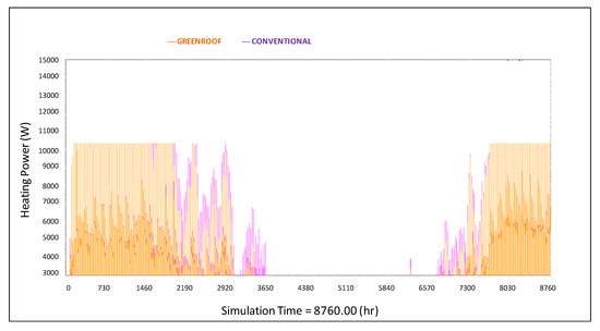 Recorded data for cooling energy demand in both scenarios (conventional and green roof) showed an energy savings of approximately 25% in cooling energy demand, decreasing the maximum peak power demand by 33%. Heating energy demand in both scenarios (conventional and green roof) is presented in Figure 17. In this case, the results show that energy heating demand increased12% in the green roof scenario. Moreover, the maximum energy peak due to heating also rose6% with the green roof in comparison to the conventional rooftop, due to the reduction of solar heat gain reaching the building.
