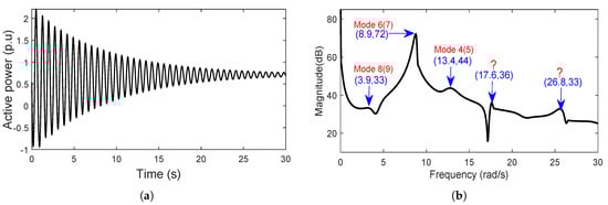 The largest interaction coefficient corresponds to a combination of eigenvalues 5 and 17 (i.e., − j13.62) which has settling time almost equal to that of the dominant mode (i.e., 3.68 s) and large . However, the new frequency is very near to the linear frequency 13.63 rad/s and is difficult to differentiate by FFT if it appears in the response. Moreover, the modal persistence is close to 1 (i.e., 0.899) hence, it may not even be observed in the response. The combination of eigenvalues 5 and 9 (i.e., − j13.63 − 0.84 − j4.03 = − j17.66) has relatively large interaction coefficient (1.579) and low (0.549) with settling time well above half that of the dominant mode (i.e., 1/2 × 3.68s), and relatively high . These observations indicate that mode 4(5) is interacting nonlinearly with mode 8(9). Notice that the new frequency 17.66 rad/s is approximately observed in the FFT spectrum of Figure 4b (i.e., 17.6 rad/s). Also, down the table, there is a self combination of eigenvalues 5 and 5 (i.e., − j13.63 − 1.02 − j13.63 = − j27.26) which leads to a frequency of 27.26 rad/s, approximate value of the 26.8 rad/s appearing in the spectrum. However, its interaction coefficient is relatively small (0.227) with relatively small value of (0.113). This is consistent with Figure 4b where 26.8 rad/s frequency has low amplitude. If the test system Figure 1 is considered a two-area system, it is seen that mode 4(5) which is associated with area 2 interacts with control mode 8(9) in area 1. Control-wise, in placement of PSS to damp mode 4(5), effect of its interaction with controls in area 1 should be considered in its optimization formulation. Although, the interactions of electromechanical modes with the control modes in the same area should have more adverse effects.