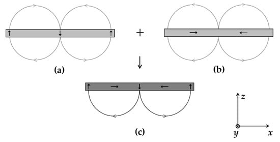 By combining the PM elements demonstrated in Figure 1a,b, the magnetic fluxes generated by the models in Figure 1a,b are superimposed, as illustrated in Figure 1c. Hence, the magnetic flux in the +z direction is canceled out and the flux in the −z direction is augmented. In other words, by using the arrangement of HA shown in Figure 1c, it is possible to add the magnetic flux flowing in the +z direction, which is not utilized, to the −z direction where the magnetic flux is used.