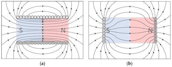 As shown in Figure 2b, the Gilbert model assumes the PM as an equivalent magnetic charge. The polarity of the magnetic charge in the Gilbert model corresponds to the North and South pole of PM. The magnetic charge is defined as a unipolar charge, not a dipole, and is distributed in the area of the corresponding polarity in the PM. Therefore, in the Gilbert model, the magnetic field generated by the PM can be calculated as done in the case of calculating the electric field of electric charge by Coulomb’s law.