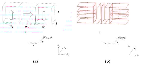 By applying Equation (8) for the model of Figure 3b, the magnetic flux density vector B(x,y,z) at the position that is at (x,y,z) from the center of the bottom of PM can be derived as Equation (9).