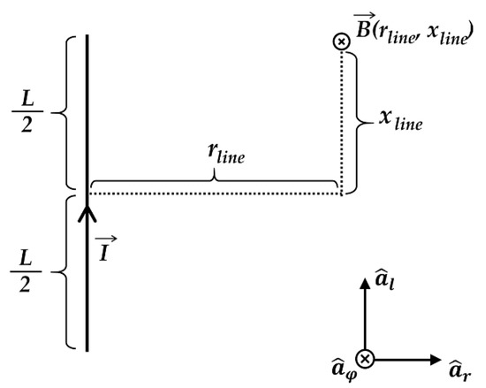 Figure 6 illustrates the magnetic flux density B(, ) at an arbitrary position that is at a vertical distance and height from the center point of the linear current I having finite length L. Based on Figure 6, Equation (7) is derived for the calculation of the magnetic flux density B(, ) generated by the line current I through the application of Equation (6) [34].