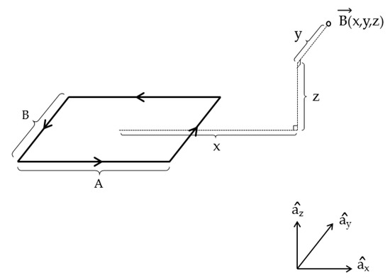Figure 7 illustrates the vector Bloop(x,y,z) of the magnetic flux density from the current loop at a point (x,y,z) relative to the center point of the loop O. The current I flows through the loop, and loop has the width A and the length B. The function of Bloop(x,y,z) in Figure 7 can be derived as Equation (8) by applying Equation (7).