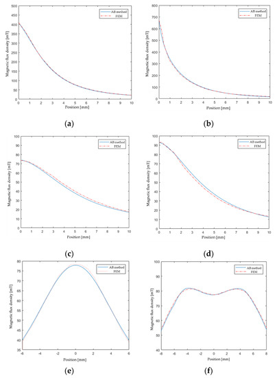 Comparison between the proposed AB method and the FEM via the calculated magnetic flux density data of the model demonstrated in Figure 3: (a) when z varies from 0 to 10 mm with (x,y) fixed at (0,0); (b) when z varies from 0 to 10 mm with (x,y) fixed at (5, −2.5); (c) when z varies from 0 to 10 mm with (x,y) fixed at (0,−6); (d) when z varies from 0 to 10 mm with (x,y) fixed at (10,0); (e) when y varies from −6 to 6 mm with (x,z) fixed at (0,5); (f) when x varies from −8 to 8 mm with (y,z) fixed at (0,5).