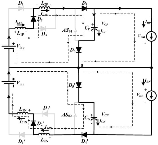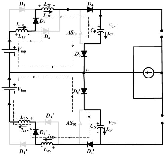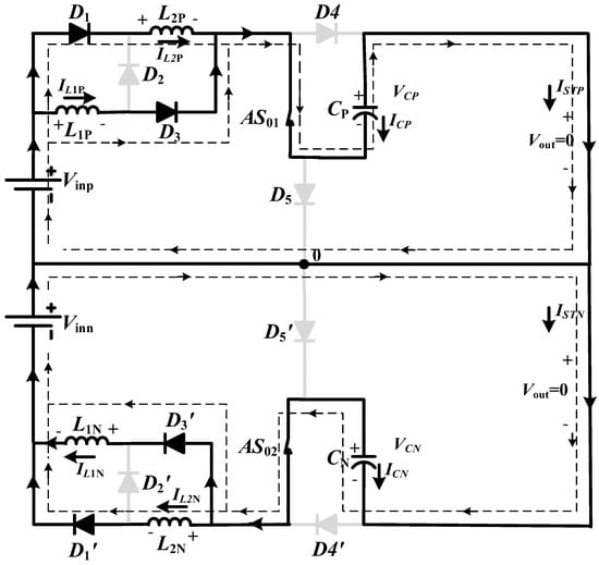 The direction of the flow of current in the equivalent circuit of zero-state is shown in Figure 3, where it traverses voltage source , inductor , diode , inductor , and capacitor and reaches back to through diode . In this path, capacitor is charged by and by both inductors and . Similarly, for the lower network capacitor, is charged by and by the combination of and , no power is transferred to load. Like in the active state, both and remain in off state.