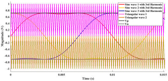 Although the Maximum Boost Control Method [31] provides a higher value of with a smaller value of stress across switches Vs; however, due to diversity in the value of for each switching cycle, it generates the low-frequency ripples in inductor current, which is not desirable [32]. To overcome this situation, and to achieve a higher value of at lower values of Vs, MCBCM was introduced to provide a constant value of by using two envelope signals and . Here, the third harmonic component with a magnitude of 1/6 of the fundamental component is dumped with the sine waves to enhance the range of . The value of is given as [32]: