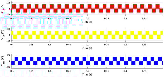 Detailed simulation results are presented from Figure 8, Figure 9, Figure 10, Figure 11, Figure 12 and Figure 13. The simulation model is designed for = 0.2855291 and = 0.825, and it offers a boost factor of 8.96, which is the same as the theoretical analysis (see (33)). The proposed inverter provides the 343 V pole voltages against the 40 V DC input voltage. The pole voltages are shown in Figure 8.