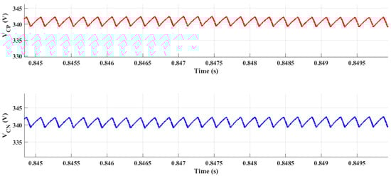 From (21) and (24), the voltage across capacitors and are the same as the pole voltages, having values of 343 V, and the same results are depicted in Figure 9. This ensures the agreement between the mathematically-calculated and simulation results. The voltages across both capacitors are well balanced.