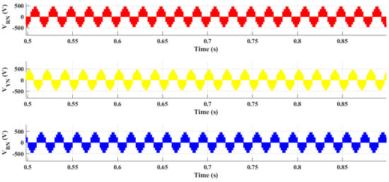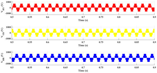 Line voltage and phase voltage are shown in Figure 11 and Figure 12, respectively. Line voltages are the difference of the pole voltages having a value of 687 V as depicted in the simulation results. Line voltages and phase voltages (the voltages between the phase and neutral points of star-connected load) are interrelated as: