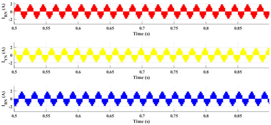 A star-connected resistive load having a resistance of 250 Ω per phase is deployed at the output of the inverter. The waveforms of phase currents are shown in Figure 13, that are in-phase with the voltage, thus improving the power quality.