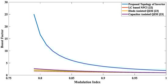 In addition, the proposed topology is most appropriate to achieve a higher boost factor by utilizing a smaller value of D with a wide range of modulation index. Figure 15 shows a relationship of boost factor versus the ST duty ratio for the proposed and the previous topologies. It can be seen that the proposed topology offers better results, even with smaller values of the ST duty ratio. Thus, this topology can be deployed in applications where higher boost is required with a smaller ST duty ratio.