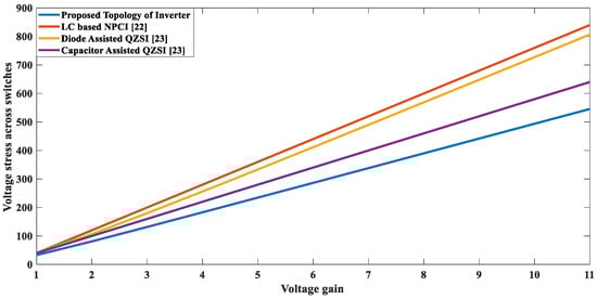 The proposed topology also shows a remarkable boosting ability with lower voltage stress across the switches. Figure 16 shows a graph between stress across switches and voltage gain, for the proposed topology and the previous topologies, indicating that the proposed topology offers much better results. It enables the availability of higher boost without increasing the stress much. Lowering in switching voltage stresses leads to the reduction of the rating of switches and the size of inverter.