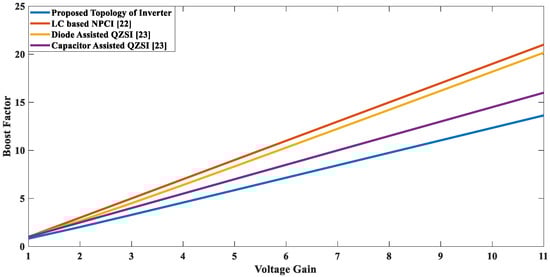 Figure 18 demonstrates the relationship between boost factor and voltage gain and exhibits that the proposed topology offers the higher voltage gain against the appropriate value of boost factor due to the availability of higher modulation index, whereas, with previous topologies, significantly lower voltage gain can be achieved from the given boost factor. It can be seen from the graph that with the proposed topology, the values of voltage gain are near the corresponding values of the boost factor.