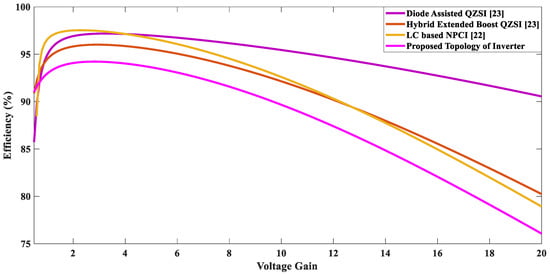 The efficiency of each topology against the overall voltage gain is computed. As can be observed from Figure 20, efficiency curves of all considered topologies are comparable with one another with a minor difference. The proposed topology offers more than 90% efficiency with a voltage gain of up to 10. With this level of efficiency, it offers several advantages in the form of higher boosting ability, lesser voltage stresses across the switches, lower shoot-through duty ratio, availability of higher modulation index, and improved quality of output waveform by reducing the THD. The reduction in voltage stresses across the switches ensures the utilization of lower rating components/devices even for a higher voltage gain, whereas in the previous topologies, the stresses across the devices drastically increase as the voltage gain increases, as depicted in Figure 16. This situation demands an enormous increase in the rating of components/devices used in previous topologies of the inverter, which leads to a tremendous increase in the cost of components/devices and the size of the inverter, which makes it bulky.