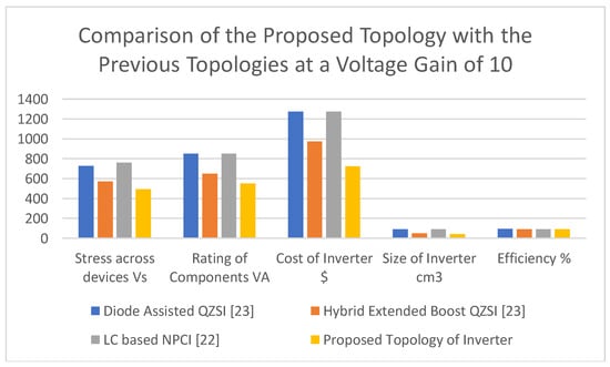 To extend our discussion further, by utilizing Table 5 and Figure 16, Figure 17, Figure 18, Figure 19 and Figure 20, a detailed comparison of the proposed inverter topology with the previous inverter topologies in terms of overall efficiency, stresses across switches, rating of components/devices, cost, and size is performed and depicted in Figure 21, for a voltage gain of 10 (this voltage is taken as a sample, although the analysis for other values is also true).