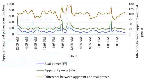Previous research confirmed the suitability of using different types of power in non-intrusive appliance load monitoring. Dong et al. [] empirically showed the ranges of real and reactive power values in the case of particular appliances. By applying clustering, they defined the clusters for selected appliances, as well as calculating the average values of both power types. The well-known interdependence between real, reactive and apparent power (its graphic representation is commonly called a power triangle) enables the calculation of each, just by knowing the other two. The data used in this research were based on real and apparent power. The calculation and application of reactive power in the model would mean the use of input variables with strong autocorrelation and high values of variance inflation factor (VIF). It was expected that this would result in the deterioration of the model’s quality. For this reason, only real and apparent power, as well as the differences between them, were used in the research. Figure 1 shows an example of both types of power and their differences for house no. 1.