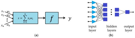 The creation of ANNs dates back to 1943, when a mathematical model of neurons was developed and presented by McCulloch and Pitts [] (Figure 2a). In 1958, Rosenblatt [] published a paper describing the model of a unidirectional network, in which neurons were grouped into successive so-called layers, with signals flowing—as the name indicates—in only one direction (from input to output). A multilayer perceptron (MLP) is composed of three types of layers: (i) a single input layer, (ii) hidden layers, (iii) an output layer (Figure 2b). The last two types of layers are subject to the learning process, which means that the neurons placed in them have the ability to acquire knowledge by modifications in the so-called weights in neurons (real numbers marked as w in Figure 2a).