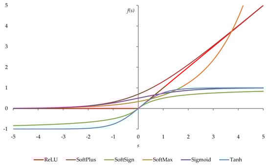 Due to the numerous limitations of the primary architecture, more advanced ANNs based on modified training algorithms, generally referred to as deep neural networks (DNNs), have been gaining popularity in recent years. Under this name, there are many types of networks built on the basis of different types of layers. Although the beginnings of deep learning algorithms in ANNs date back to 1965 [], they have only recently grown very popular. The reasons behind this surge of interest include technological developments and the increasing use of high-performance graphics processing units (GPUs) to accelerate computing in relation to the CPU. A DNN with a relatively low complexity and high level of similarity to MLP is a network containing dense layers. Its neurons commonly use the rectified linear unit (ReLU) as an activation function (defined by formula (1)). Among other functions, SoftPlus (calculated with formula (2)), SoftSign, SoftMax, Sigmoid, and Tanh are popular. The respective graphs are shown in Figure 3.