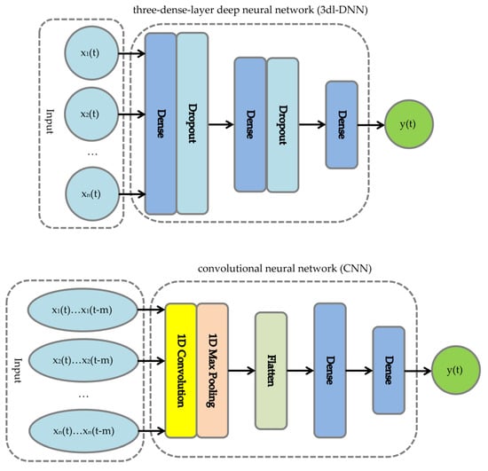 DNNs built of three dense layers (3dl-DNN) and CNNs were applied in this research. DNNs use mainly the rectified linear unit (ReLU). The possibility of using other activation functions, such as SoftPlus, SoftSign, SoftMax, Sigmoid, and Tanh, was also tested during the research process. Figure 4 presents the structure of the DNNs used in the research.