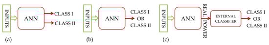 Modelling device activity is a classification issue. For this reason, the ANN structure must enable the status of a given device to be assigned to one of the classes (as a minimum). As this research has distinguished between two different states of devices (active and inactive), the final objective reveals a dichotomous problem. There are three popular approaches based on ANN, which involve a different number of neurons in the output layer, and the stage at which the final classification is made. Figure 5 shows their structure, as adapted to the requirements of this study.