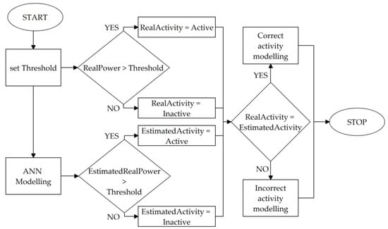 Model (a) has two outputs, and only one class must be chosen. This problem can be solved by choosing the class, for which the output value is closer to one. In model (b) only a single neuron is used in an output layer. When its value is equal to zero, it represents one state (e.g., inactivity), whereas when it is equal to one it represents the state of activity. As a continuous activation function used in the neuron, ANN generates output in the form of real numbers in some ranges, e.g., from zero to one for Sigmoid. It is necessary to set a threshold (typically equal to 0.5) below which the answer is understood as zero (inactivity), and over which the answer is considered as one (active). A similar approach is applied in model (c), in which output values of real power consumed by an appliance are assigned to the class by an external classifier working according to the rules applied in model (b), with thresholds as presented in Section 2.5. Model (c) was used in this paper. Figure 6 presents the algorithm for classifying real and estimated appliance activity by the external classifier. In the research, the same threshold was used to assign an appliance activity to one of the two classes on the basis of real data and the modelled device operation. Using two different values of thresholds in the external classifier could generate more accurate results; however, such an approach was rejected for the study due to the risk of not maintaining full objectivity. Two outputs allow the use of such a model in non-dichotomous issues and take into account the situation when two classes can be chosen simultaneously.